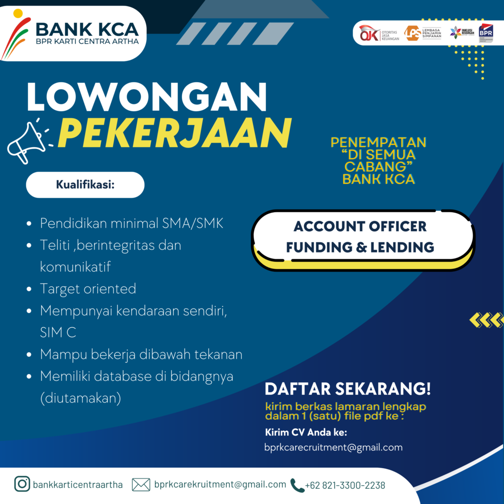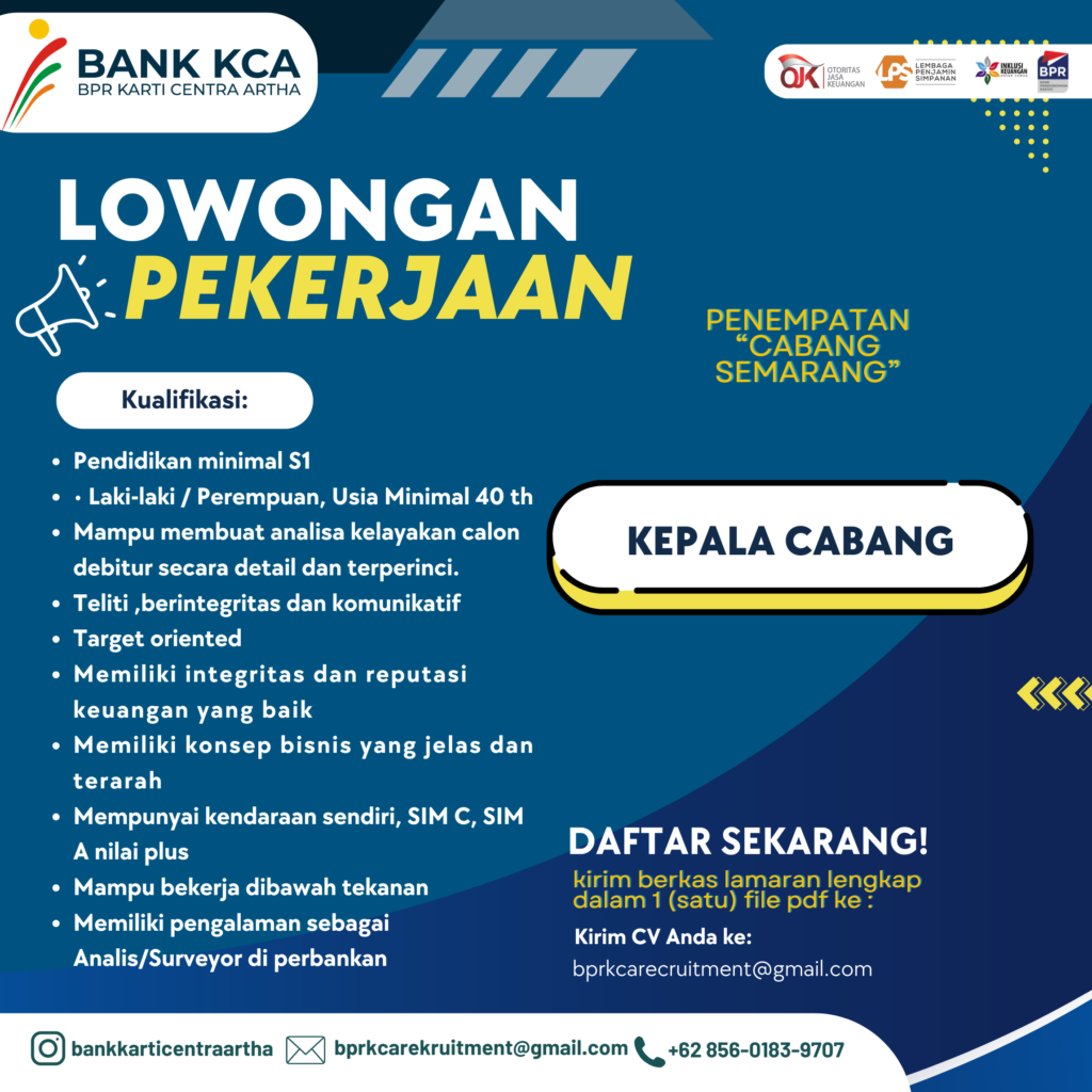 KARIR BPR KARTI CENTRA ARTHA LOWONGAN YANG TERSEDIA :Kepala Cabang Account Officer Daftar Sekarang! Kirim CV Anda ke: bprkcarecruitment@gmail.com Cantumkan posisi yang di inginkan & akun Instagram anda